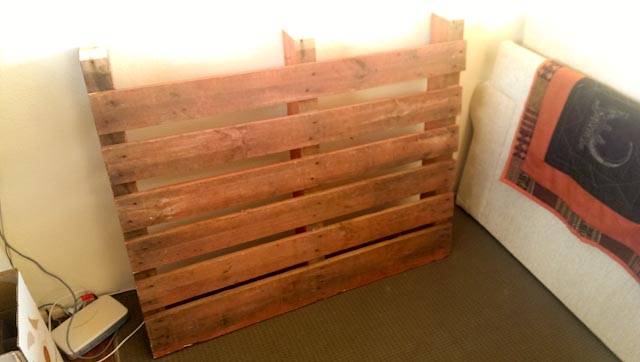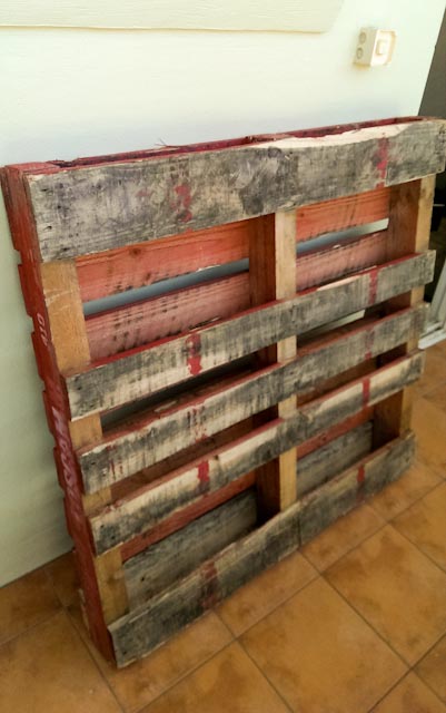 The all important pallet. It’s amazing how different pallets are – not just colour and condition, but shapes and sizes, materials, etc. We went to the pick up area of a department store and asked the guy if we could have a pallet, he said no worries, and we spent the next hour discussing the pros and cons of each one because there was such a variety. We saw some perfect pallets in bunnings – brand new, bare wood, immaculate condition, a cool stamp down the side, beautifully shaped main beams, but they had half a ton of bricks on them and bunnings refused to let ANY of their pallets go anyway. So basically have a look around and choose wisely. We got a red beast that was a bit shabby chic around the edges, but big and strong. Big and strong is not necessarily a good thing when you’re trying to pull it apart though (as you’ll see), but at the minimum make sure it is real wood and not compressed rubbish.