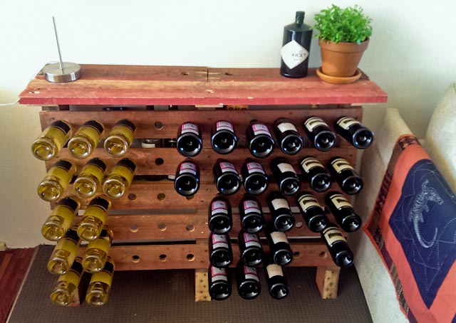 It seems these days that any decent homemade furnishing project incorporates a wooden pallet at some point. And why not? Free wood that is already hammered into an approximation of the shape you want…bosch! I quite like the wine racks that hold the neck of the bottle rather than the body, and I started thinking about those single bottle holders that are just a small plank with a hole in that balance a bottle of wine by the neck. Could you do that with 40 bottles of wine? Seems dangerous, but I guess you can always build feet or lean it against a wall if it doesn’t balance.