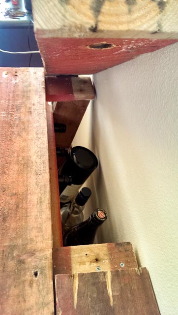 At this point we ran out of time for the day and had to give up, so we put the pallet in place where we envisaged it living and left it there till the following weekend. This was a surprisingly cunning idea as it meant we could live with what it looked like and how it fit in. We decided to take that bottom plank off for a start, but then the genius inside us started to come out and there was a large amount of discussion as to the top of the wine rack – I was after a fully integrated booze system with the spirit bottles (or wine glasses) half hidden on a small ledge inside the rack, whilst my better half envisaged a shelf at the top with trailing plants to look all vineyard-y. I liked the sound of that but we obviously couldn’t have both, however after a lot of chat, we worked out a way we could. If the shelf opened, the spirits could be housed right down inside the pallet – same thing as I wanted but they were just further down…ah, the importance of having someone to talk to with these projects!