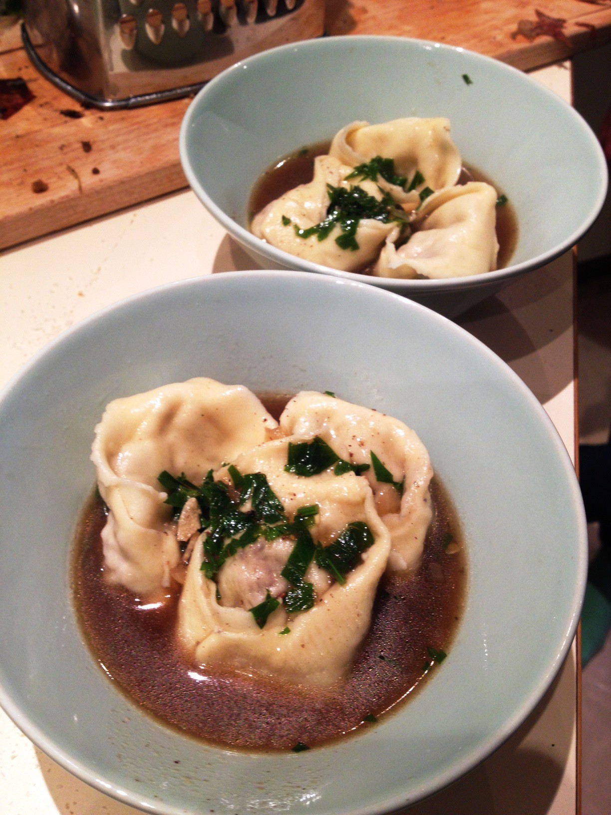 This one time, in Scot-Land (said in whiny American pie voice) we made rabbit pie (not American pie – this is confusing) and part of the process is to simmer the rabbit for an hour first – so I smuggled some of the rabbit out of the pot and some of the stock and made rabbit, mushroom and blue cheese tortellini in rabbit broth.