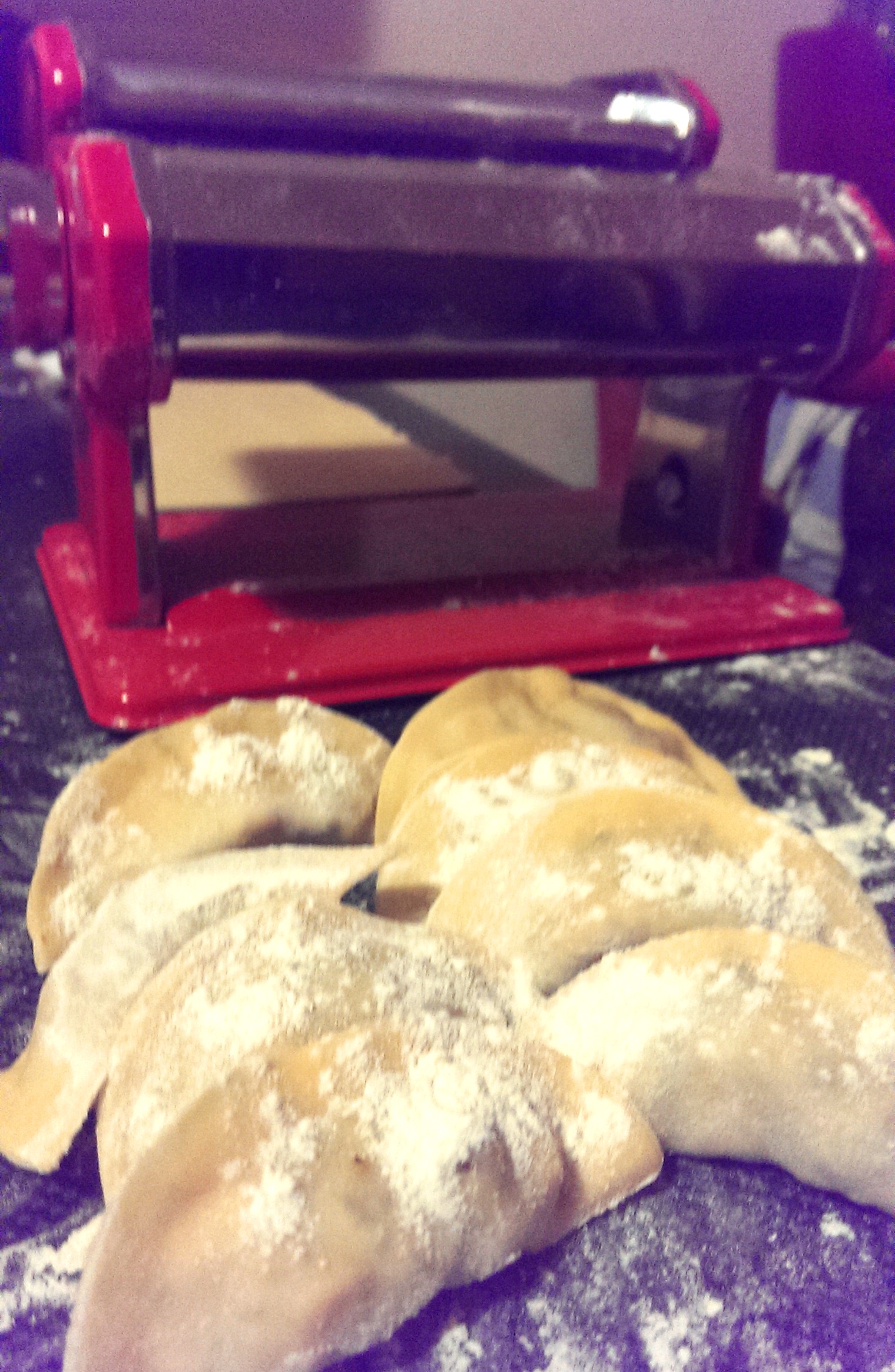 But first, a quick run down on how to stuff your pasta successfully because there are a couple of pitfalls that could ruin your pasta stuffing day. Firstly you want your pasta rolled out to one of the lowest two settings on your machine. Flour everything as you go and don’t get a drop of liquid near your workspace because things will start to stick, and you know what they say when things get sticky……nope? Actually, neither do I. When you have a length of pasta on your floured workbench, throw some shapes – cut squares with a knife, use a round cutter, whatever, but make sure they’re a reasonable size so they’re easier to handle. Get a dollop of your filling and put it in the centre without dropping any on the edges you’re going to stick – if you do, that piece is generally shafted and won’t stick and you can dump it. Gently squeeze your filling and wrap your dough around it (or put another piece on top if you’re that way inclined), dip your finger in water and smear it on one of the sides you want to stick. As you close it, squeeze as much of the air out as possible to stop them exploding, and squeeze firmly all the way round. When you put them down, make sure it’s on a floured surface and the pasta is floured too, otherwise they’ll be sticking together.